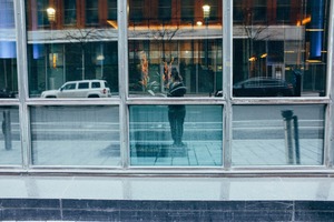 This photograph captures a moment of urban contemplation through a storefront window. The muted reflections of vehicles and buildings blend with hints of vibrant greenery, creating a juxtaposition of nature and city life. Soft lighting enhances the serene yet slightly melancholic mood, inviting viewers to explore the hidden stories within the glass.