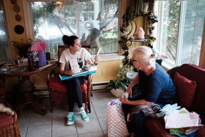 In a cozy sunlit room, a young girl sits cross-legged, engaged in conversation with an older woman, highlighting their relationship. The warm, soft lighting creates an intimate atmosphere, while the clutter of gift bags and papers suggests a celebratory occasion. The contrasting expressions of curiosity and attentiveness enrich the scene, evoking a sense of shared joy and connection between generations.