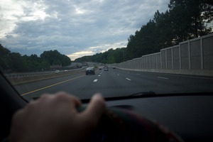 The photograph captures a view from inside a car, with a hand gripping the steering wheel, as it navigates an expansive highway. The cloudy sky looms above, casting a muted light over the scene, enhancing the contemplative mood of travel. Lush greenery lines the road, contrasting with the asphalt, suggesting a serene yet dynamic journey ahead.