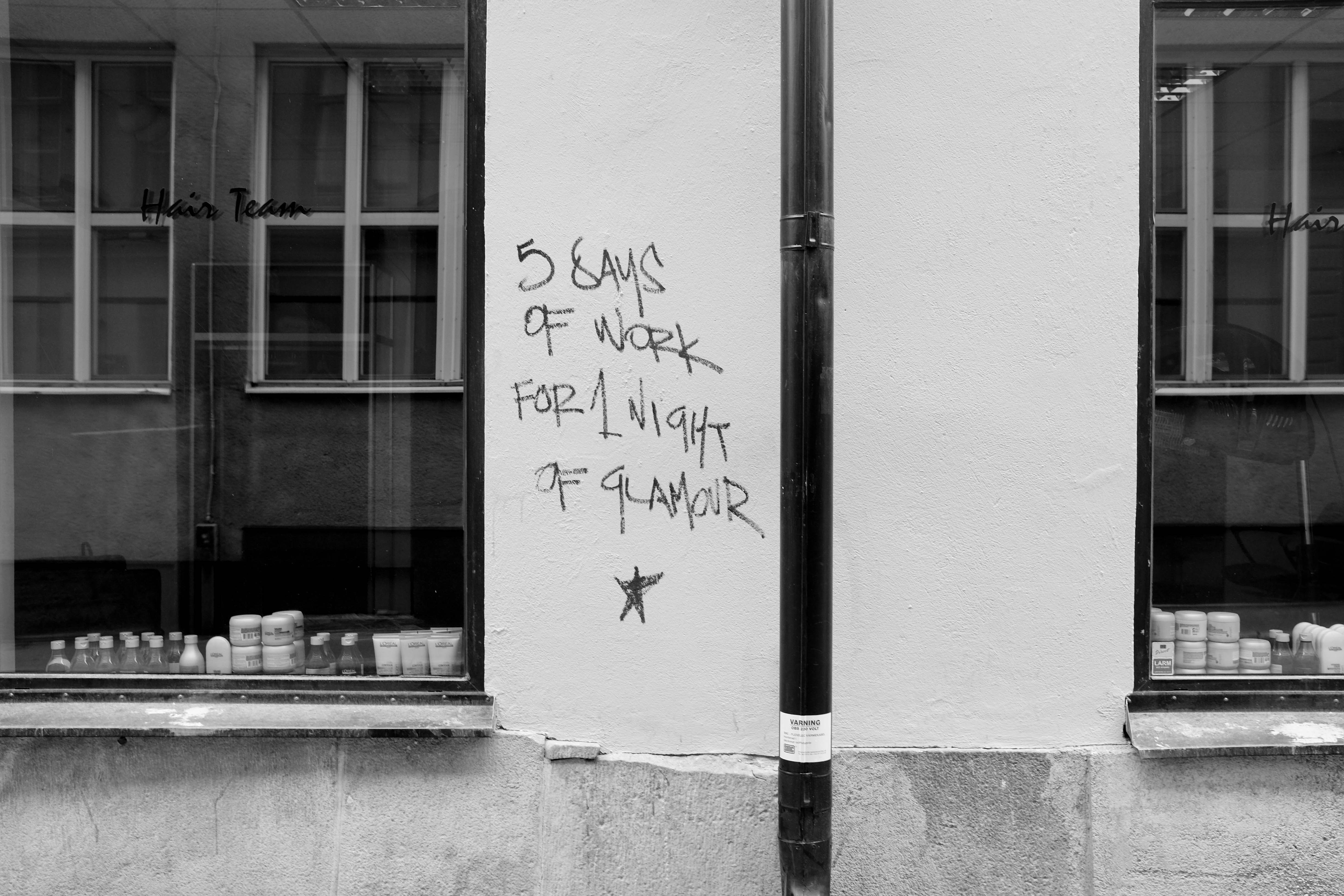 A stark black-and-white photograph capturing a gritty urban wall, where graffiti boldly declares, "5 days of work for 1 night of glamour." The contrast of the smooth, reflective windows from a hair salon juxtaposes the rawness of the message, creating a mood that blends aspiration with reality. Subtle lighting accentuates the textures of the wall, drawing attention to both the words and the silent observations of the everyday scene.