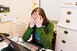 The image captures a woman sitting at her desk, her hands covering her face in a moment of distress. Soft, warm lighting illuminates her surroundings, enhancing a sense of isolation and emotional weight as clutter and a laptop frame her struggle with frustration and overwhelm.