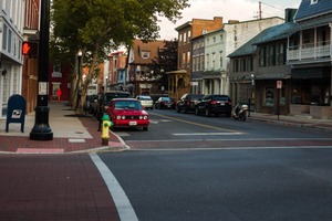 This photograph captures a quaint street lined with historic buildings, exuding a nostalgic charm. The warm evening light bathes the scene, highlighting a vibrant red car parked amidst a quiet flow of traffic. The composition balances architectural details and lush foliage, inviting viewers to explore the serene atmosphere of this small town.