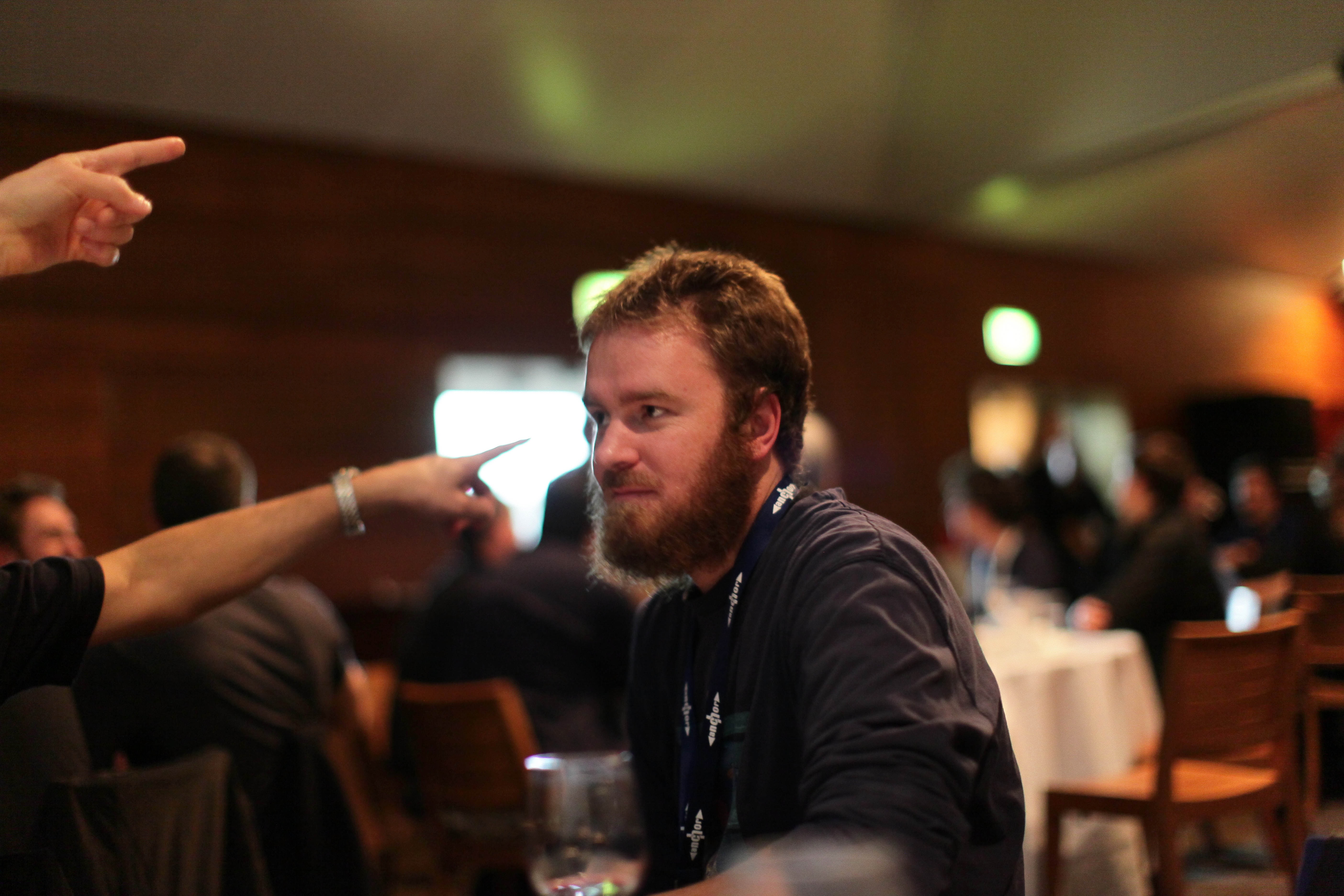 In a lively gathering, a young man with a beard sits in the foreground, absorbed in thought while being pointed at by an unseen individual. The warm ambient lighting creates an inviting atmosphere, contrasting with the focused expression on his face, suggesting a mix of curiosity and amusement. The blurred background adds depth, hinting at the social dynamics of the event.