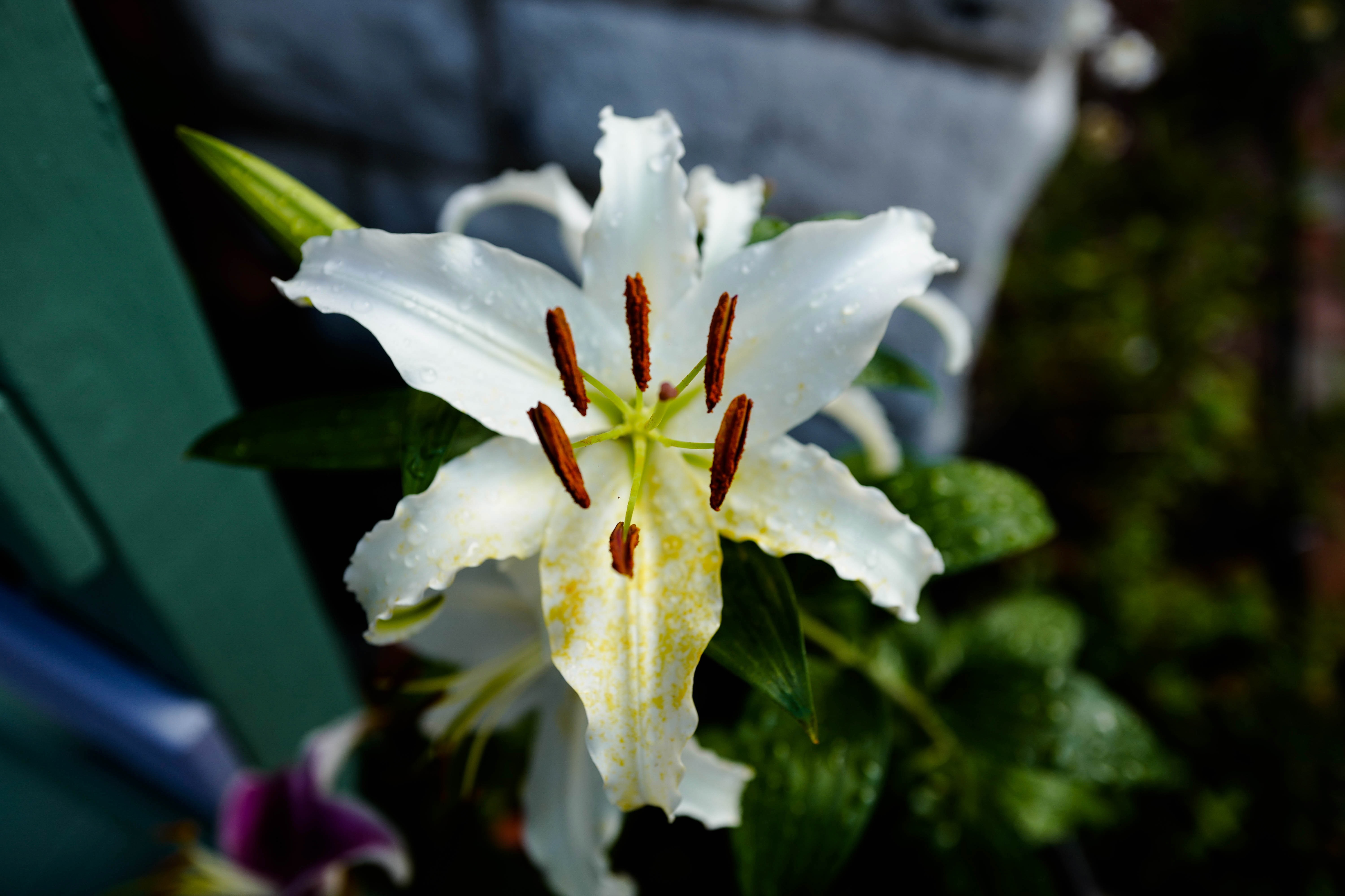 A pristine white lily blossoms at the forefront, crowned by delicate droplets of water that catch the light, enhancing its fresh allure. The composition draws the eye inward, showcasing the intricate details of its petals and vibrant stamens. Soft, natural lighting creates a serene and inviting mood, contrasting with the earthy tones of the background.