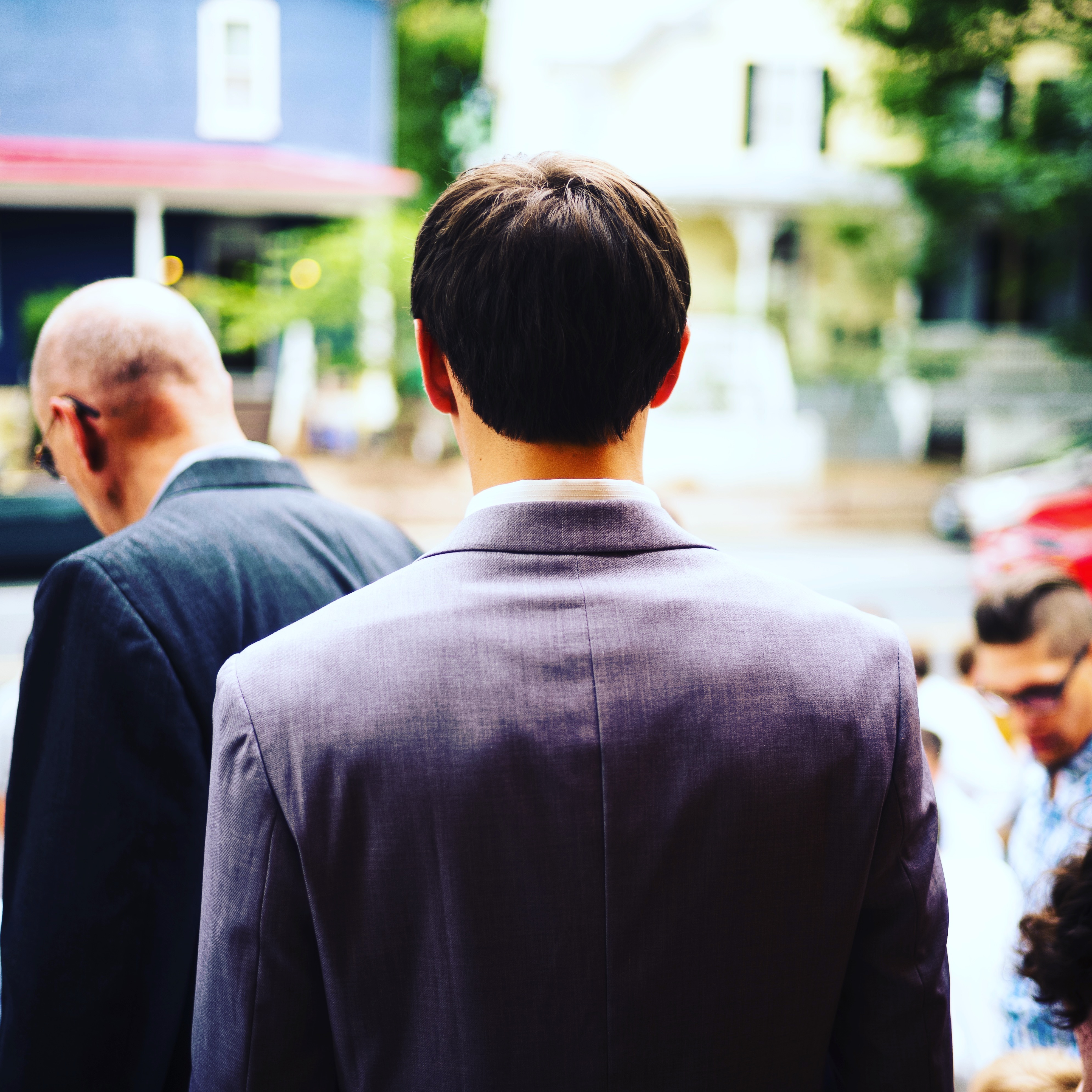 In this photograph, a young man in a tailored suit stands in the foreground, his back turned to the viewer, while an older gentleman beside him adds depth to the scene. The soft, diffused lighting enhances the thoughtful mood, suggesting a moment of connection between generations. The blurred background hints at a gathering, creating a sense of intimacy and contemplation in the atmosphere.