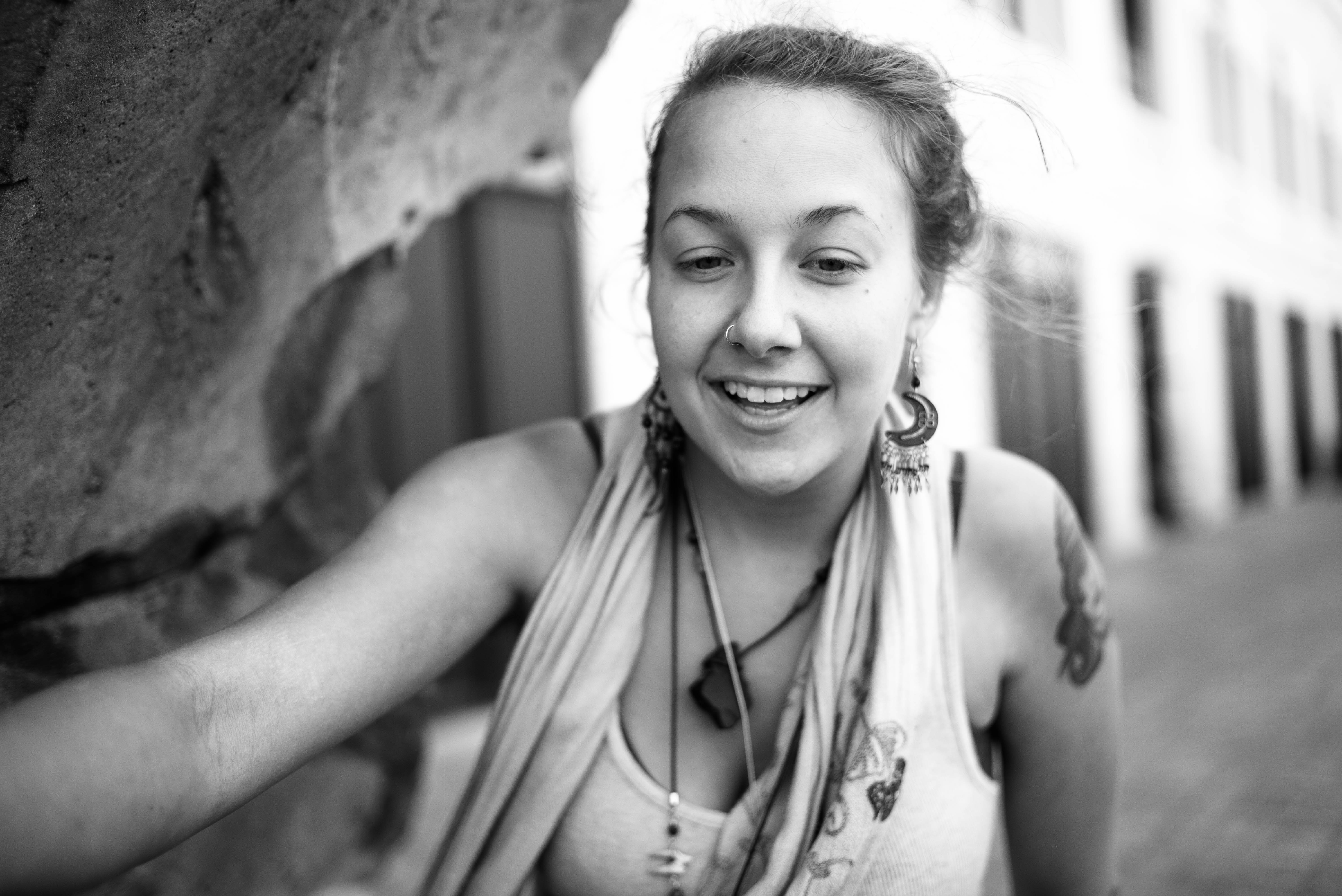 A young woman smiles warmly, her cheerful demeanor captured in striking black and white. The soft lighting accentuates her features, while the textured background adds depth to the composition, creating an inviting atmosphere. Her bohemian style and confident pose suggest a spirit of openness and joy, inviting connection with the viewer.