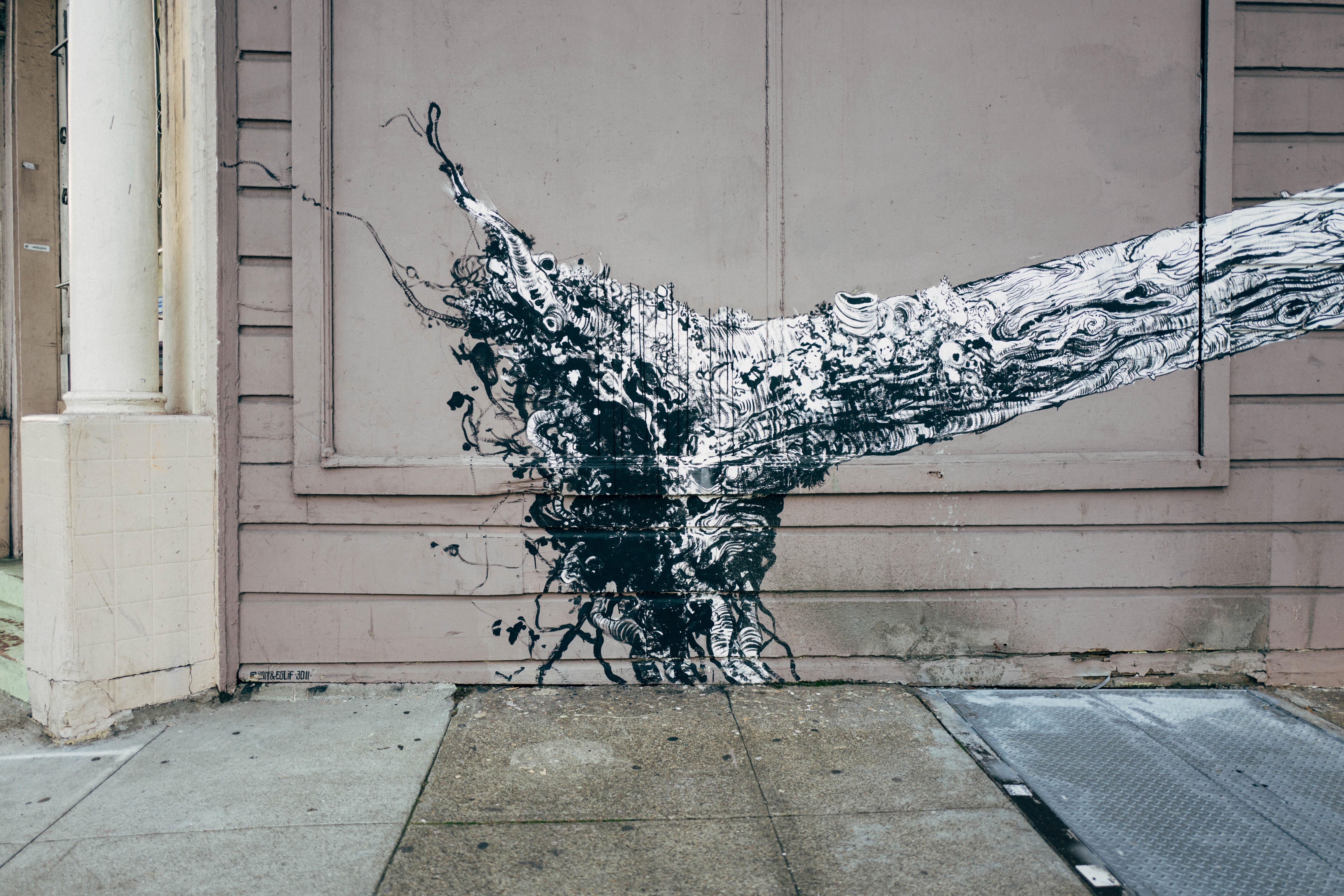 This photograph features a striking black and white mural depicting a dynamic, stylized branch extending from the wall, blending organic and abstract elements. The mood is contemplative, evoking a sense of nature's resilience amidst an urban backdrop. Soft, diffused lighting enhances the intricacies of the design, highlighting the contrast between the vibrant mural and the muted pink wall.