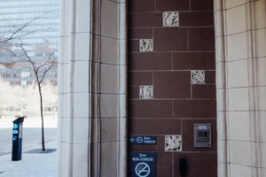 The photograph captures a blend of architectural detail and urban life, focusing on a textured wall adorned with carved decorations. Soft natural light filters through, creating a tranquil mood contrasted by the modern elements in the background. The composition highlights the juxtaposition of old and new, drawing the eye toward the subtle directional signs and a bare tree, suggesting a calm yet lively environment.