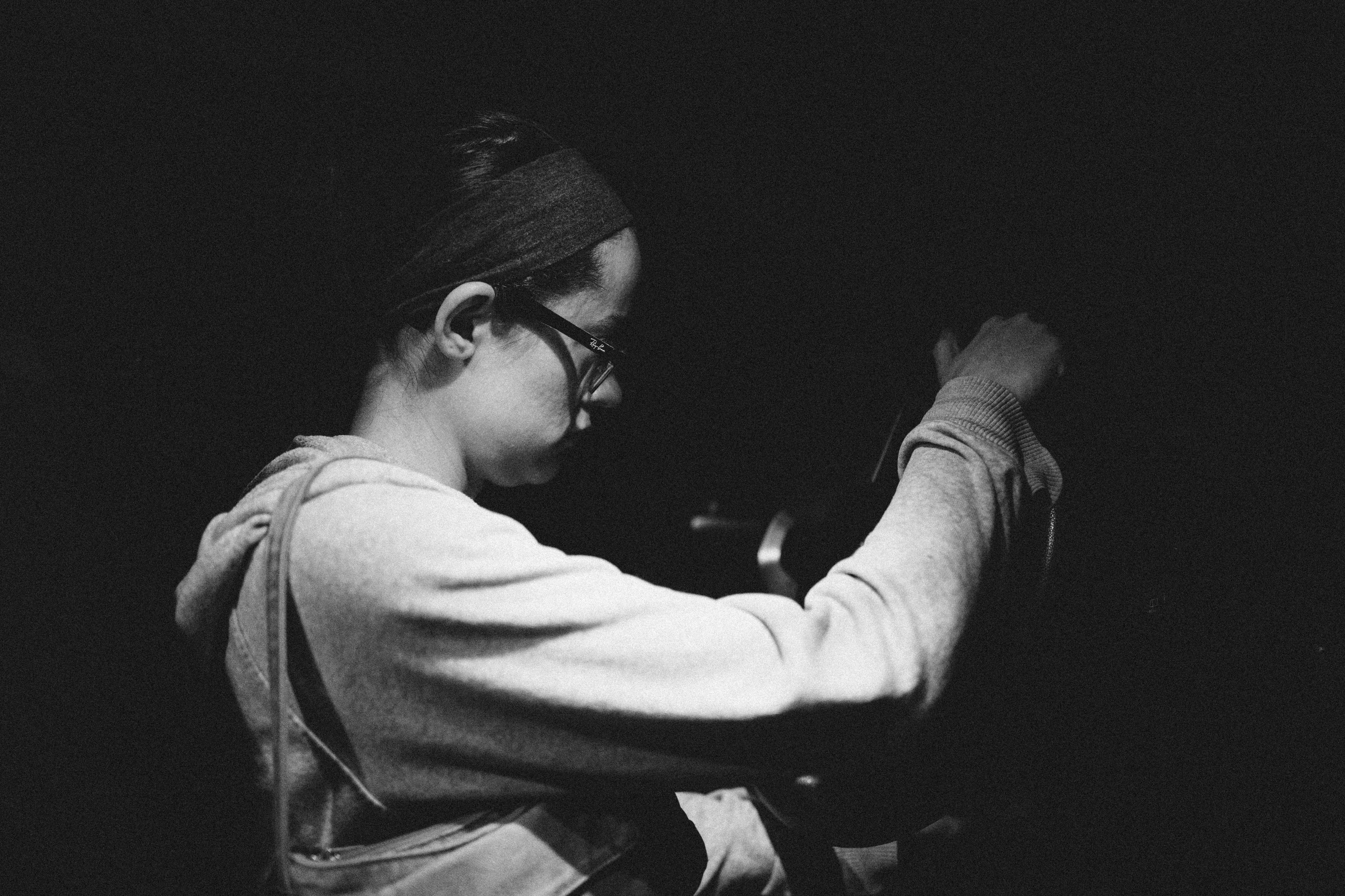 In this striking black-and-white photograph, a young woman is captured in a moment of quiet concentration, her profile illuminated by soft, diffuse light that contrasts starkly against the surrounding darkness. The subtle details of her expression and the texture of her clothing evoke a feeling of introspection, while the muted tones enhance the overall mood of calm and focus. Her attire and posture suggest an earnest engagement with her task, drawing the viewer into the intimate atmosphere of the scene.