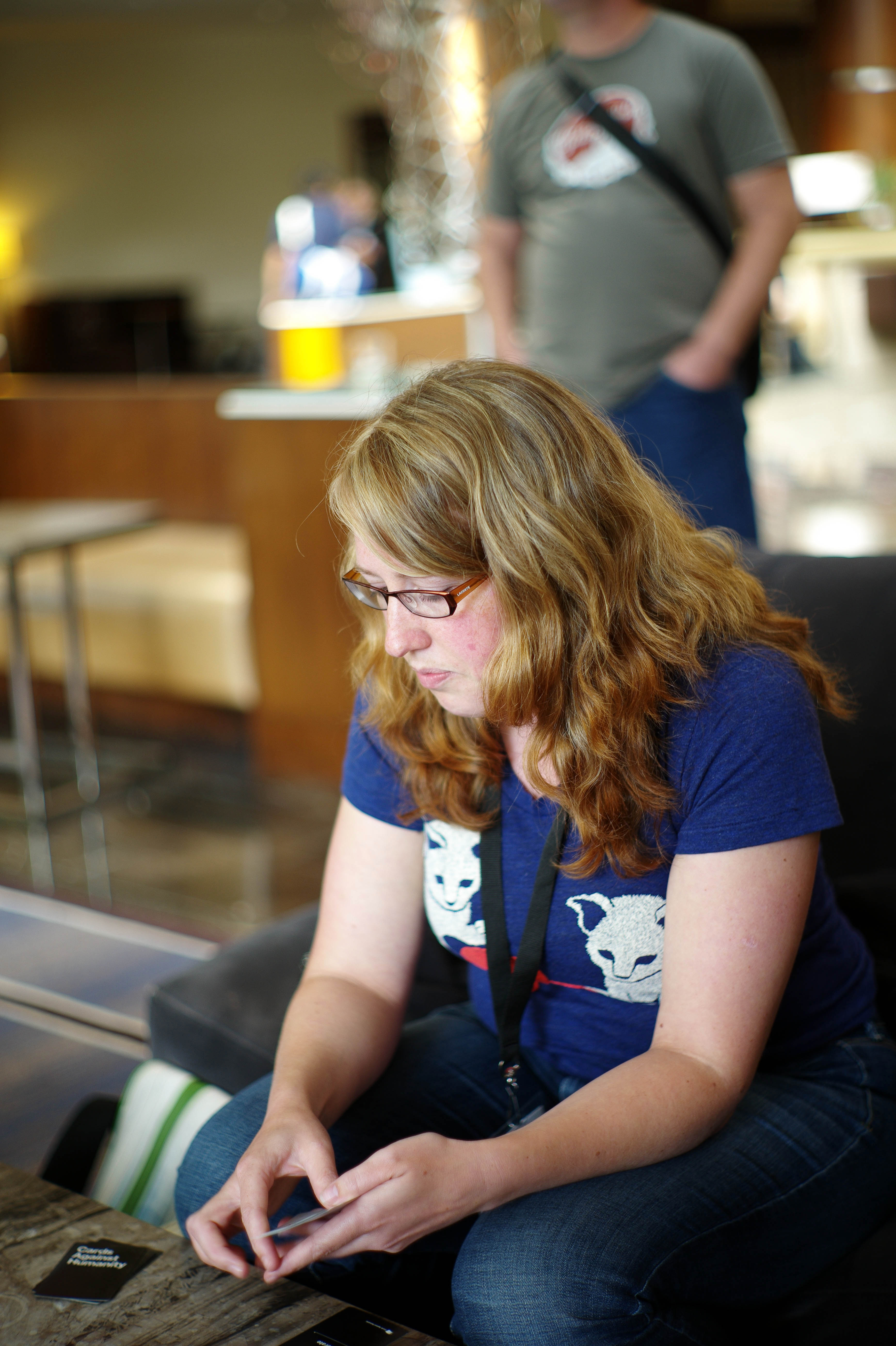 In an engaging indoor setting, a woman with wavy, light brown hair sits comfortably, absorbed in thought while fiddling with her hands. The soft, warm lighting creates an intimate atmosphere, accentuating her focused expression amidst a blurred backdrop of casual conversations and activity. The composition captures a moment of stillness amidst a lively environment, inviting viewers to share in her reflective mood.