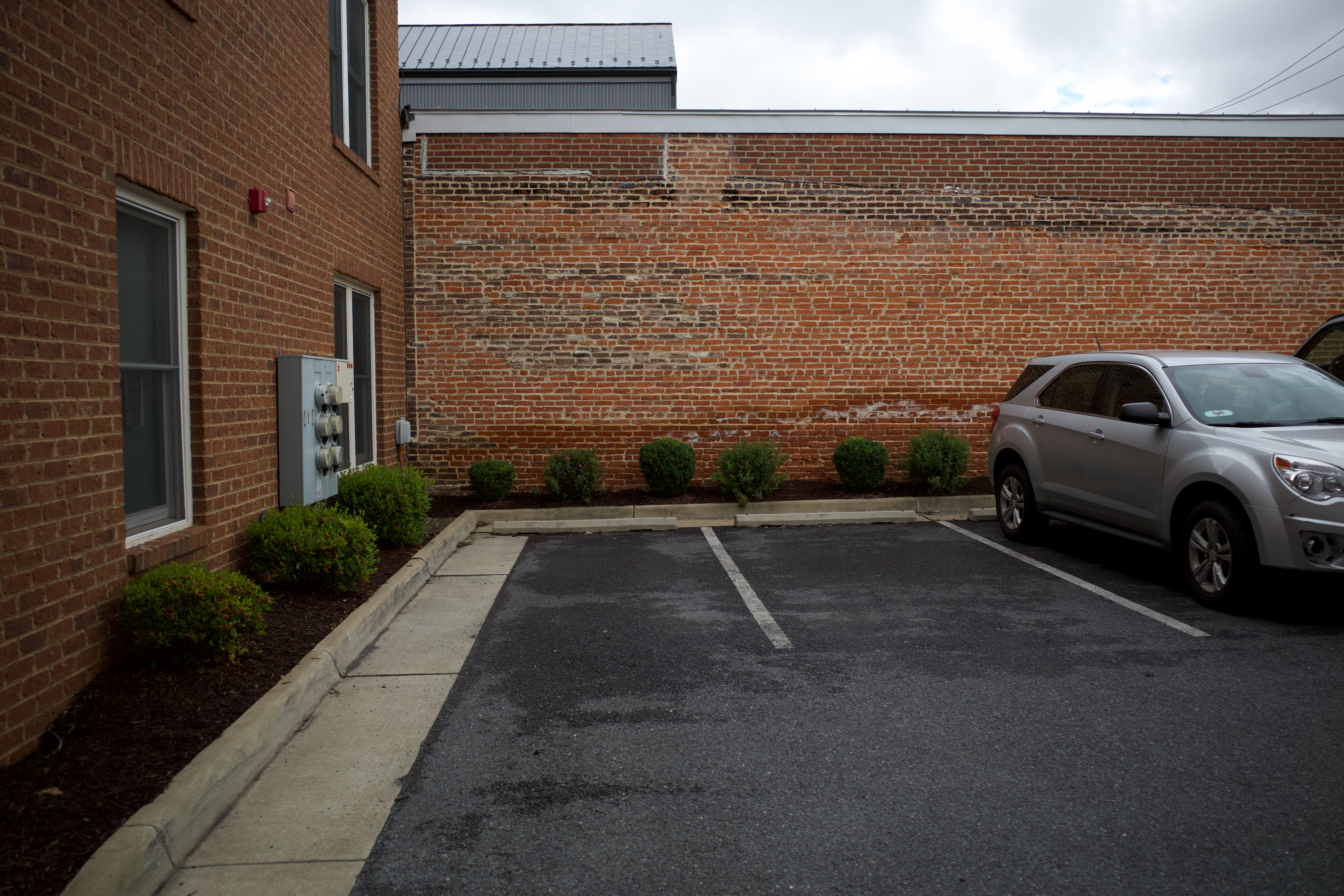 A quiet parking area lies secluded against a textured brick wall, creating a stark contrast between the roughness of the surface and the neatly trimmed greenery. Soft, diffused light envelops the scene, lending a calm, subdued atmosphere, while a solitary silver SUV adds a hint of modernity to the otherwise minimal composition. The absence of activity suggests a moment frozen in time, inviting reflection on the urban landscape's interplay of nature and structure.