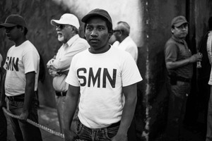 In this monochrome photograph, a young man in a white shirt emblazoned with 'SMN' stands at the forefront, his serious expression contrasting with the more relaxed individuals behind him. The composition captures a moment of tension, with the play of light and shadow emphasizing the man's contemplative gaze. The overall mood evokes a sense of anticipation and solidarity among the group, each person silently sharing in a collective experience.
