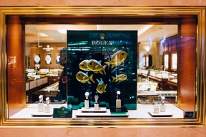 The photograph captures an elegant Rolex store window, where high-end watches are displayed under soft, warm light. A vibrant mural of golden fish adds a whimsical touch against a backdrop of luxurious decor, evoking a sense of opulence and allure. The reflections in the glass hint at a bustling environment outside, contrasting the serene yet sophisticated atmosphere inside.