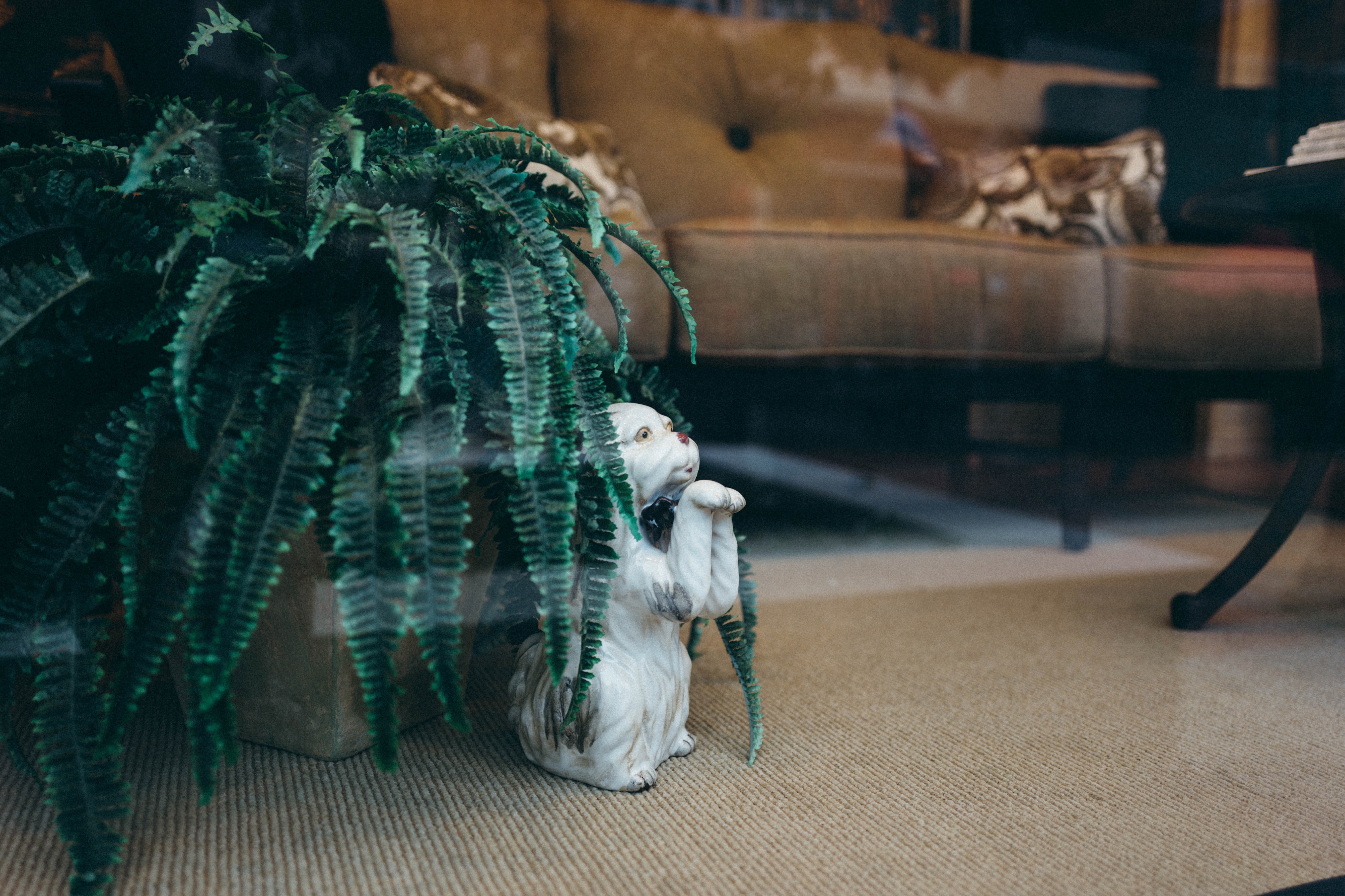 A porcelain cat statue, frozen in a playful pose, emerges from behind lush green ferns, creating a charming juxtaposition with the soft, warm hues of the background couch. The scene is both inviting and nostalgic, illuminated by gentle, diffused light that suggests a cozy indoor setting. The layering of elements draws the viewer's eye, evoking a sense of curiosity and tranquility.