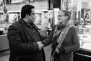 In this monochromatic photograph, two individuals share a warm handshake, their expressions conveying a sense of mutual respect and connection. The soft lighting enhances the intimacy of the moment, while the blurred background hints at a casual yet sophisticated environment. The thoughtful composition invites viewers to appreciate the significance of personal interactions in everyday settings.