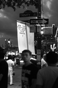 In this black-and-white photograph, a provocative banner reads 'ARE YOU PREPARED TO MEET YOUR MAKER?' against a dimly lit urban backdrop. The blurred figures of pedestrians convey a sense of anonymity and urgency, contrasting with the stark message hanging above. The moody lighting and urban setting evoke a blend of contemplation and existential unease, drawing the viewer into its poignant atmosphere.