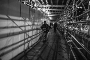This black-and-white photograph captures a dimly lit urban walkway framed by scaffolding, where a musician strums his guitar while passersby move in the shadows. The contrast of light and dark creates a poignant mood, blending artistry with the starkness of the surrounding construction. The elongated shadows evoke a sense of solitude amidst the bustle, highlighting the isolated beauty of nighttime street life.