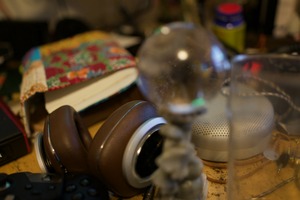 This photograph captures a cluttered workspace, where headphones and a small decorative object create a sense of intimacy. Soft, diffused lighting enhances the warmth of the scene, evoking a mood of creative chaos. The shallow depth of field draws attention to the foreground elements, suggesting a personal connection to the assortment of items.