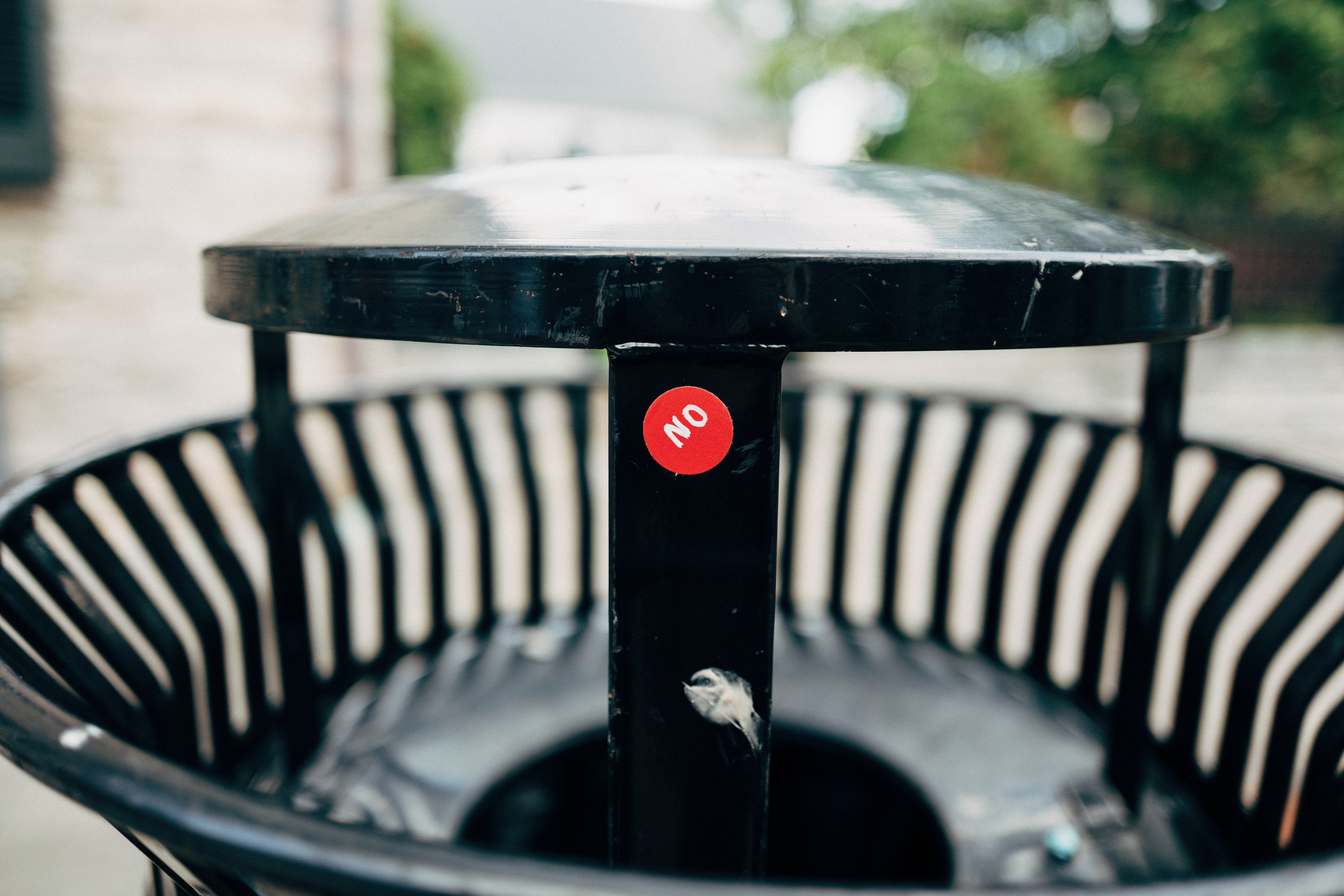 The photograph captures a close-up of a black trash bin, its sleek lines and glossy surface contrasting against the vibrant red 'NO' sticker affixed to its side. The composition draws the eye inward, creating a sense of confinement and emphasis on the message, while soft natural light filters through the background, enhancing the mood of quiet defiance. The juxtaposition of the playful color against the mundane subject renders an unexpected emotional impact, challenging the viewer's perceptions.