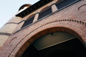 This photograph captures the grandeur of an old brick building from a low angle, creating a sense of upward movement. The warm hues of the bricks contrast with the cool blues of the sky, lending a nostalgic yet timeless mood. Shadows and lines lead the eye through the arched opening, emphasizing the architectural details against a serene backdrop.