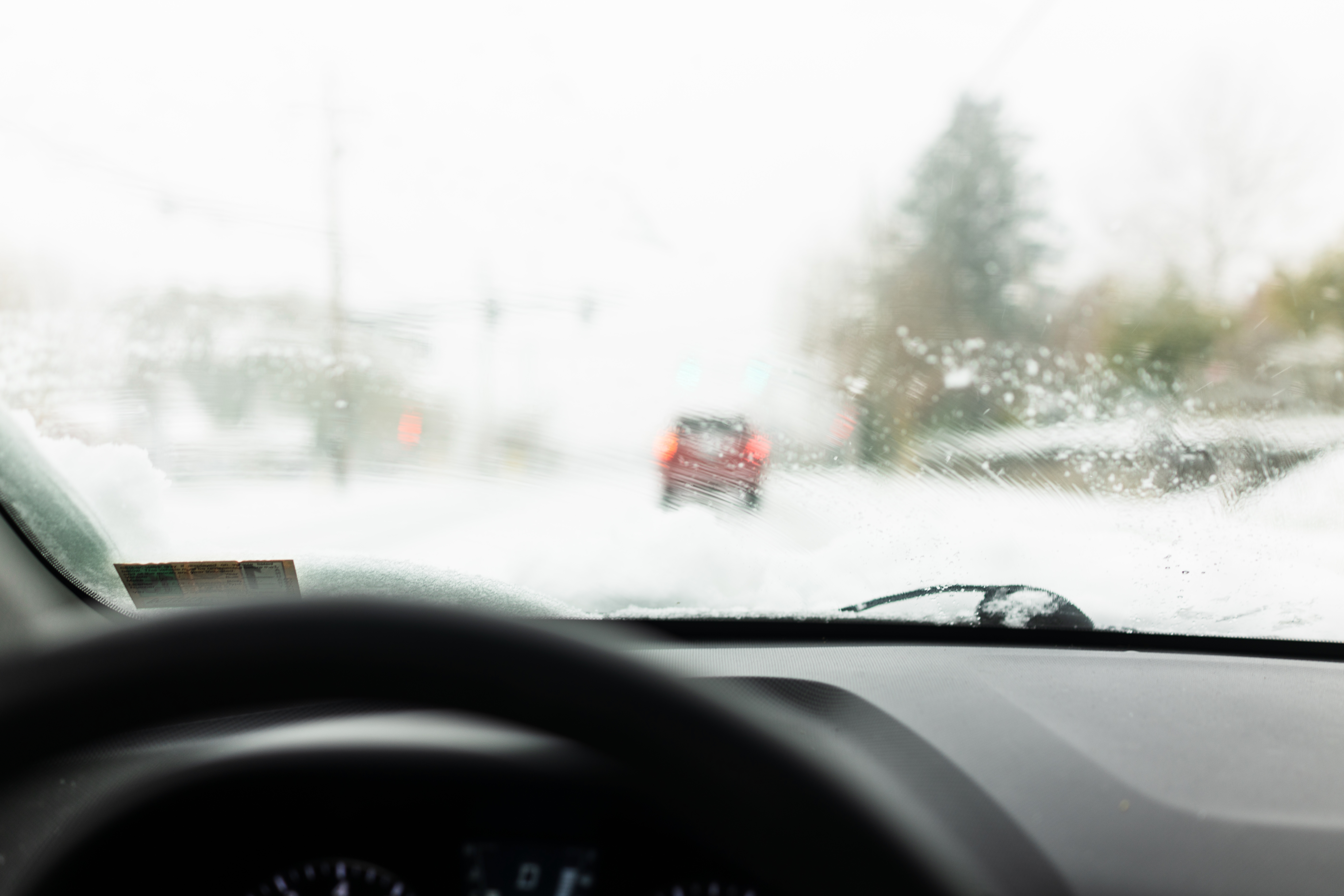 The photograph captures a blurred view from inside a car, where snow partially obstructs the windshield, creating a wintry haze. A red vehicle is visible in the distance, illuminated by green traffic lights that hint at a sense of urgency amidst the cold, white surroundings. The soft lighting and muted colors evoke a somber, introspective mood, emphasizing the challenges of navigating through harsh winter weather.