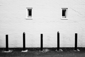 This photograph presents a stark, black-and-white composition of a plain white wall accented by two small windows and several black bollards. The clean lines and minimal distractions create a feeling of solitude and stillness, evoking a sense of quiet contemplation. The interplay of light and shadow enhances the geometric nature of the scene, drawing attention to the contrast between the vertical posts and the flat surface behind them.