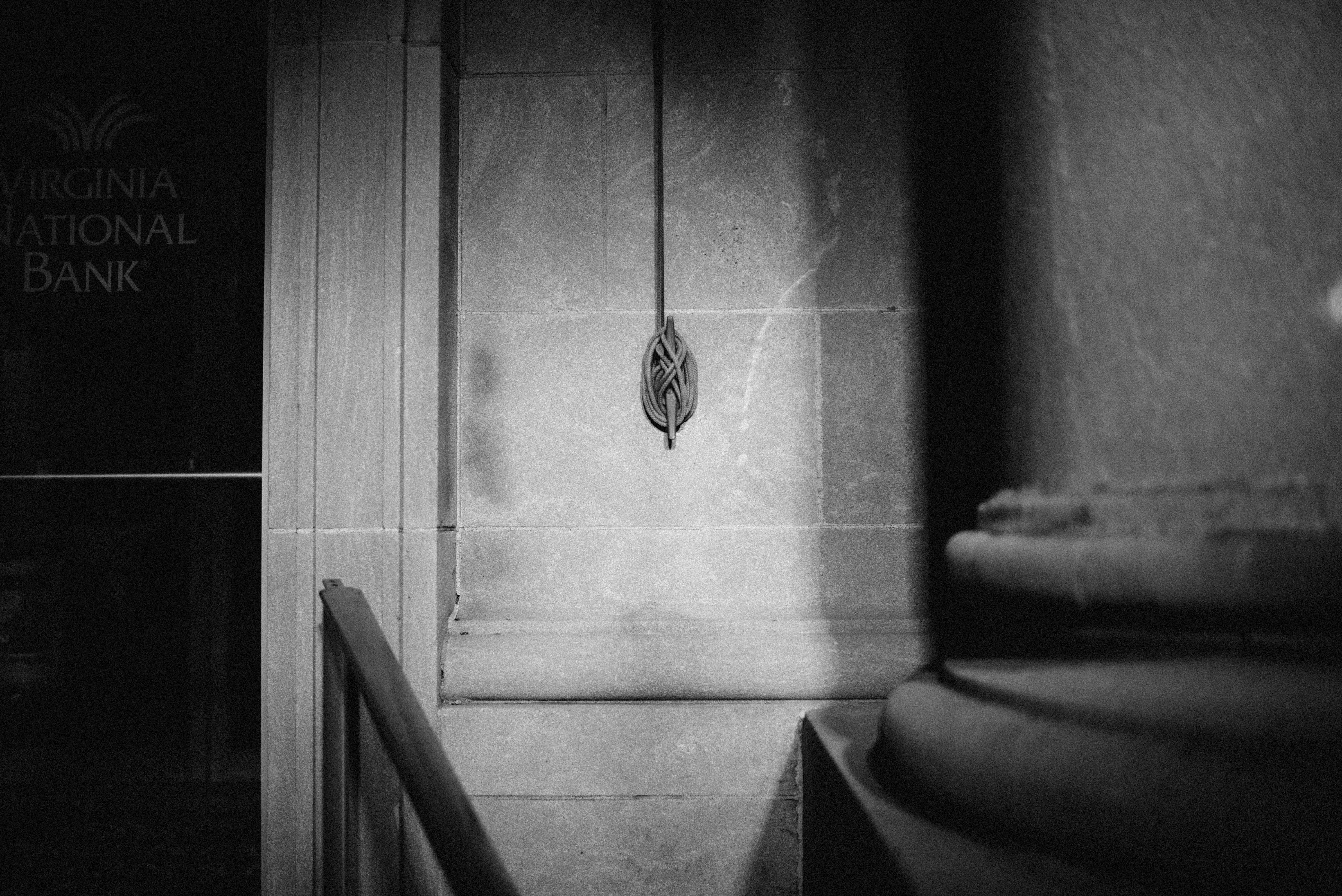 Shadowy and intimate, this monochrome photograph captures the elegant detail of a bank's architectural element against a textured wall. The interplay of light and shadow evokes a sense of nostalgia, while the minimal composition draws attention to the meticulous craftsmanship. An atmospheric stillness permeates the scene, inviting contemplation of the space's history and significance.