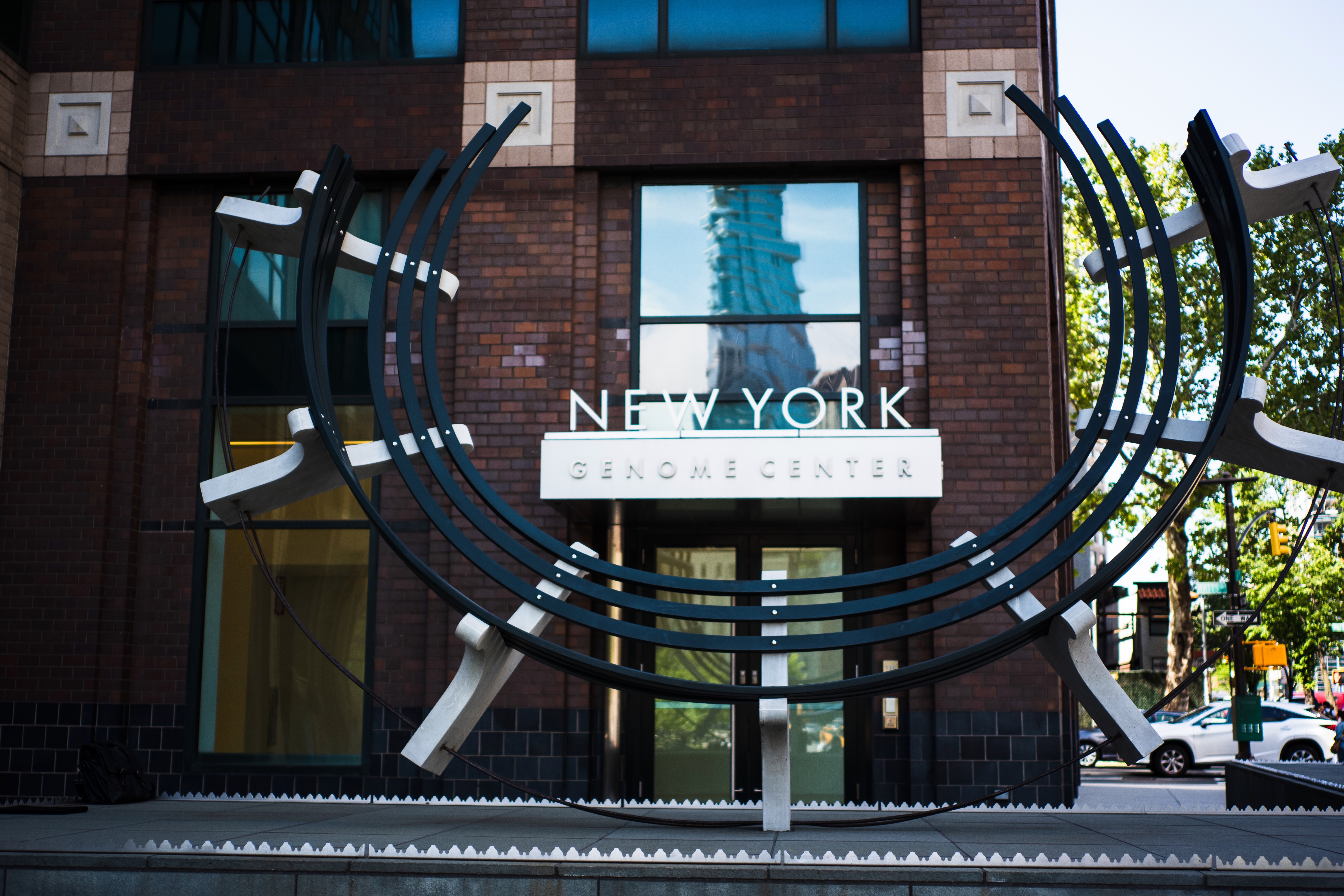The photograph captures the modern facade of the New York Genome Center, framed by a striking sculpture that echoes themes of DNA and innovation. Bright daylight enhances the sleek lines and textures of the building, creating a vibrant atmosphere that invites curiosity. The reflections in the glass windows add depth, subtly connecting the structure to its dynamic urban surroundings.