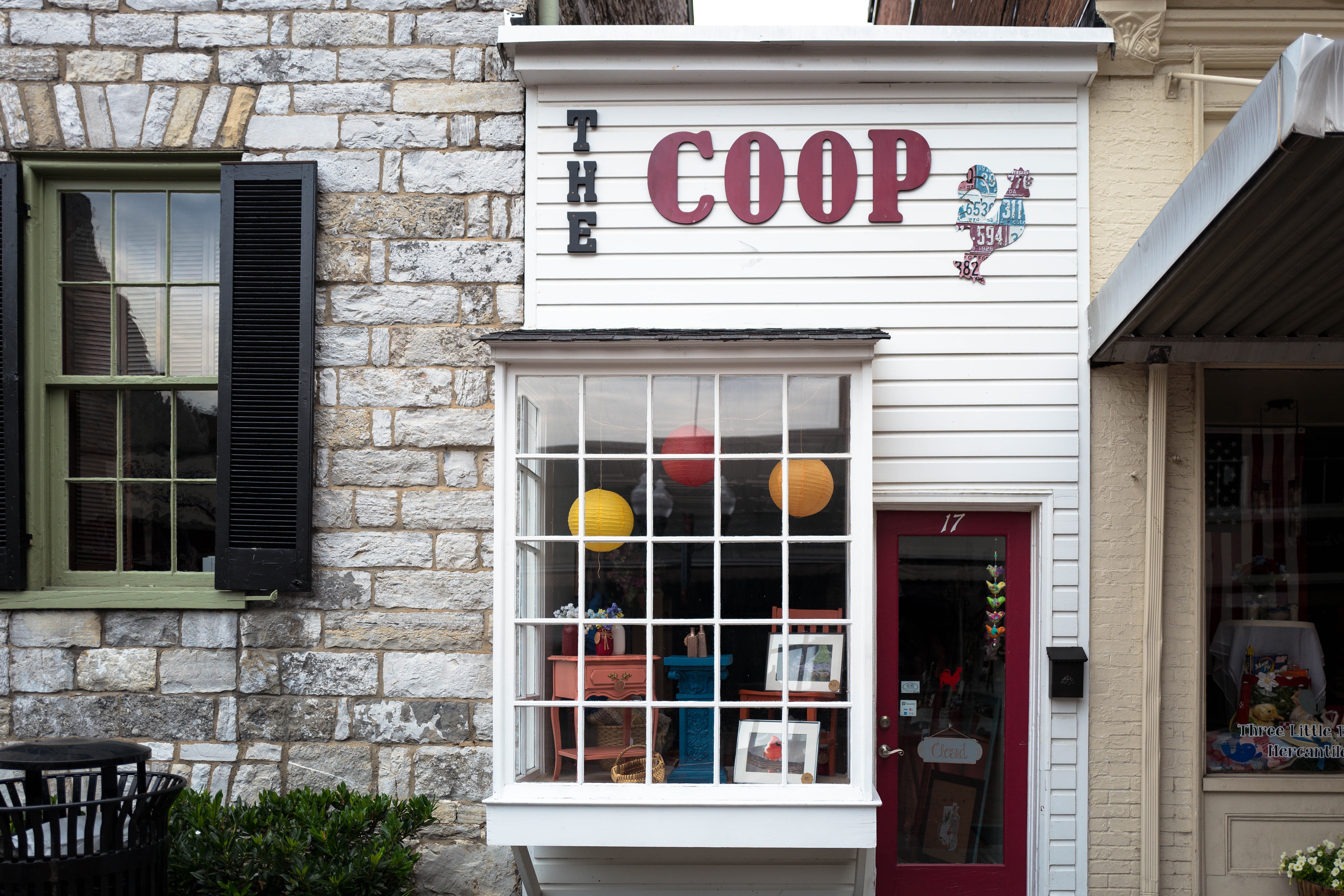 The photograph captures a quaint boutique titled 'The Coop,' characterized by its vibrant signage and large window adorned with colorful lanterns. The juxtaposition of the weathered stone wall beside it adds a rustic charm, creating a warm and inviting atmosphere. Soft, natural light highlights the storefront, enhancing the cheerful mood and inviting passersby to explore its offerings.