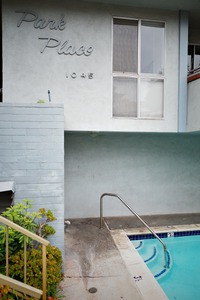 This photograph captures the serene ambiance of a simple, modern apartment complex, hinting at a peaceful lifestyle. Soft, muted colors and gentle natural light highlight the cool tones of the building and the inviting poolside area. The composition draws the eye toward the water's edge, evoking a sense of calm and contemplation amid urban living.