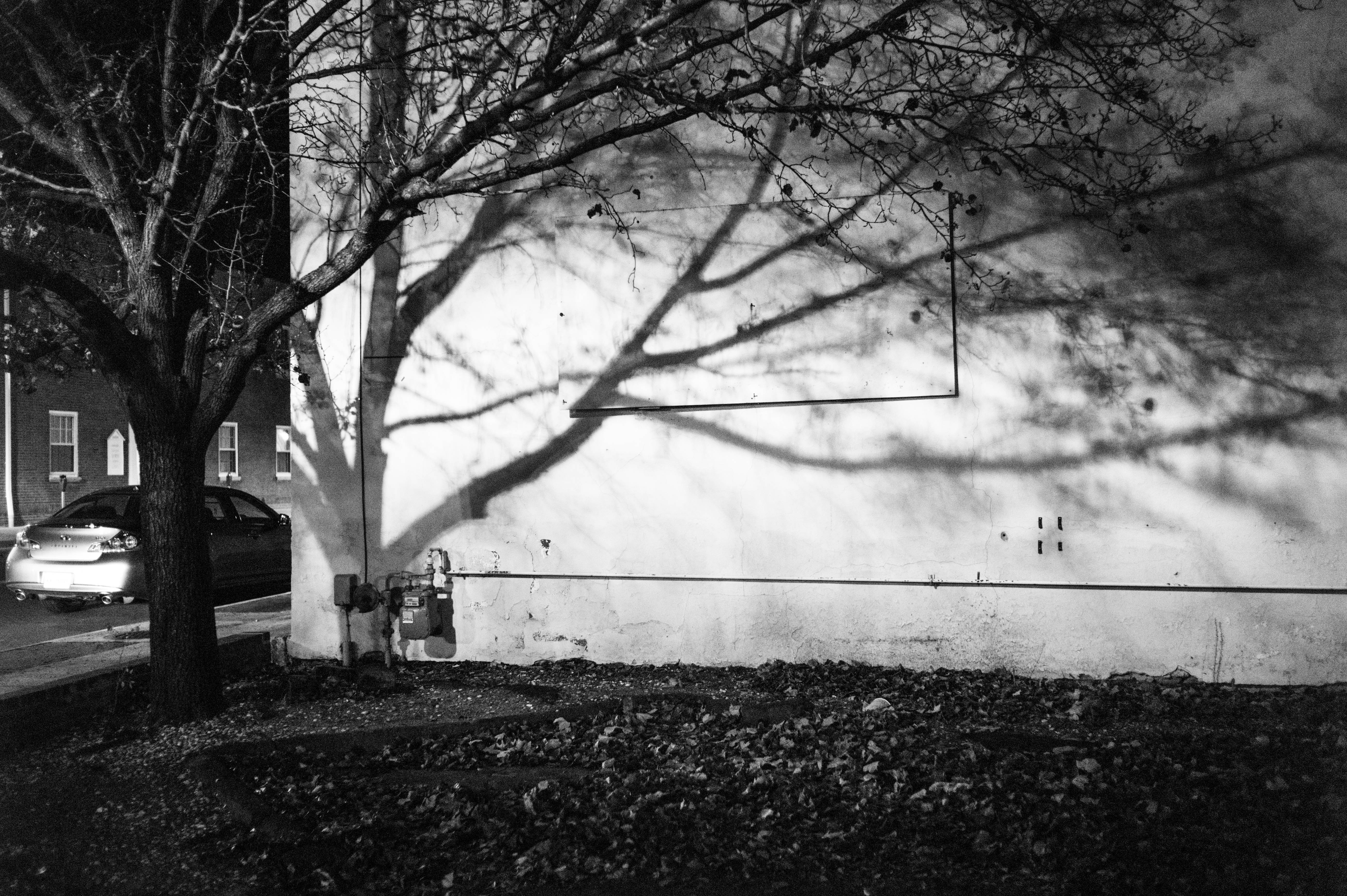 In this stark black-and-white photograph, the gnarled branches of a tree stretch across a faded wall, casting intricate shadows that create an almost haunting atmosphere. The composition is minimal yet potent, with the lonely tree and its shadow stark against the backdrop of urban night. Soft illumination accentuates the contrasts, inviting a sense of solitude and reflection in the cool evening air.