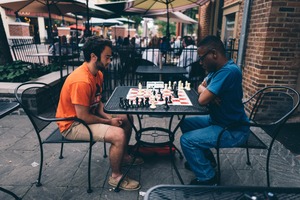 Two focused players engage in a strategic chess match at an outdoor café, enveloped in a contemplative atmosphere. The interplay of soft, natural light filters through umbrellas, casting gentle shadows while highlighting the intensity on their faces. The composition draws the viewer's eye to the intricate chessboard, rich in contrasting black and white pieces, symbolizing the mental duel in progress.