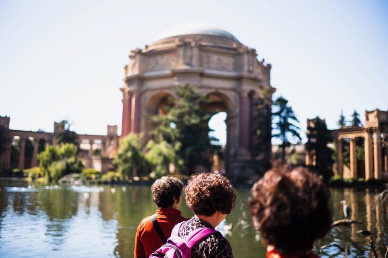 In this evocative scene, three figures stand in silhouette against the majestic backdrop of a grand architectural structure beside a tranquil pond. The bright sunlight casts a warm glow, illuminating the rich colors and textures of the building while creating a serene atmosphere. The composition beautifully juxtaposes the figures with the grandeur of the Palace of Fine Arts, inviting viewers to contemplate both the beauty of nature and human artistry.
