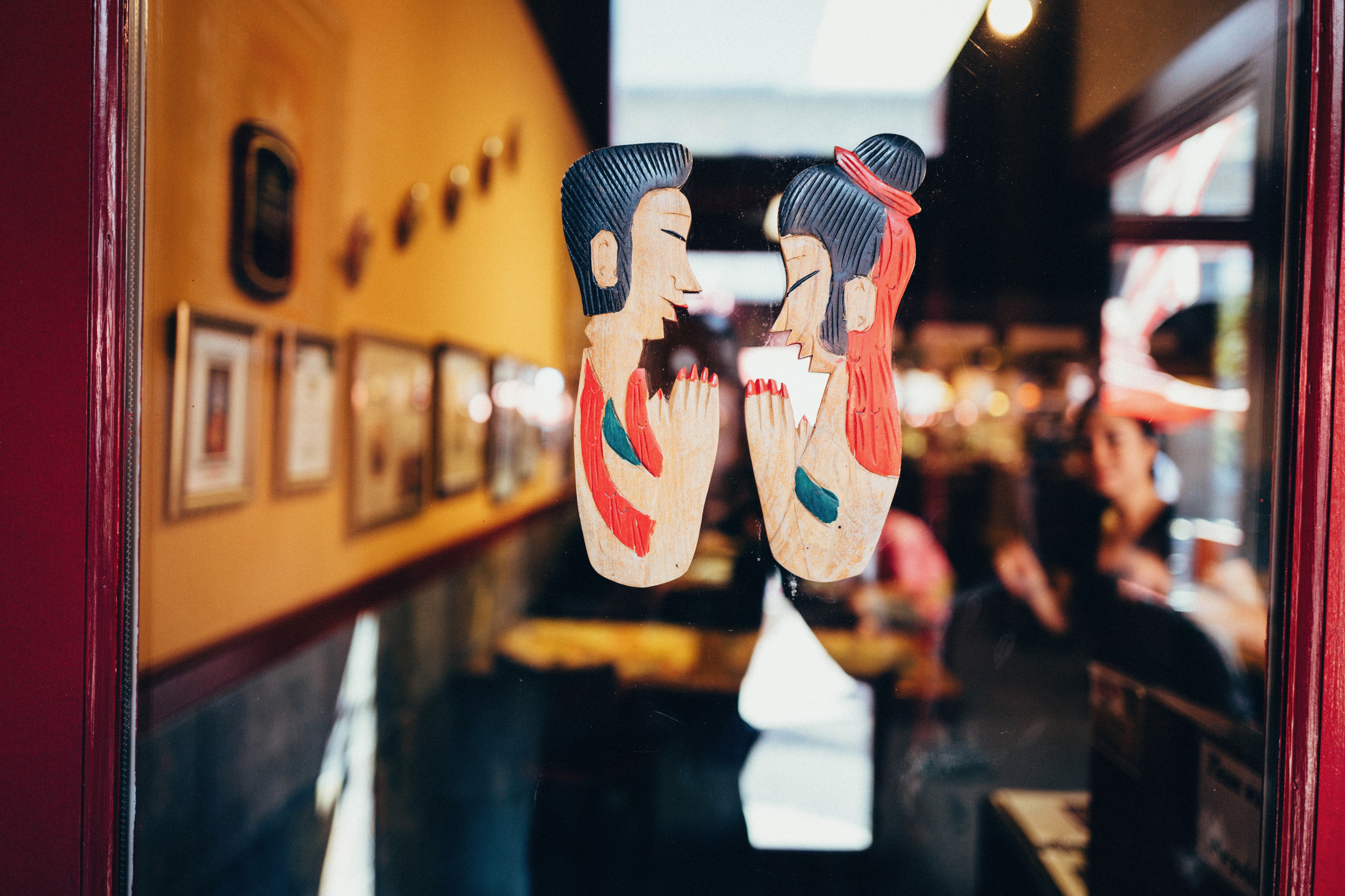 This photograph captures a pair of vibrant wooden figures gazing at each other through a glass window, creating a moment of connection amidst the bustling interior of a café. The warm, soft lighting accentuates the cheerful colors of the carvings, contrasting with the blurred, busy background that suggests life and activity. The composition invites viewers to ponder the relationship between the art and the human interactions occurring just beyond the glass.