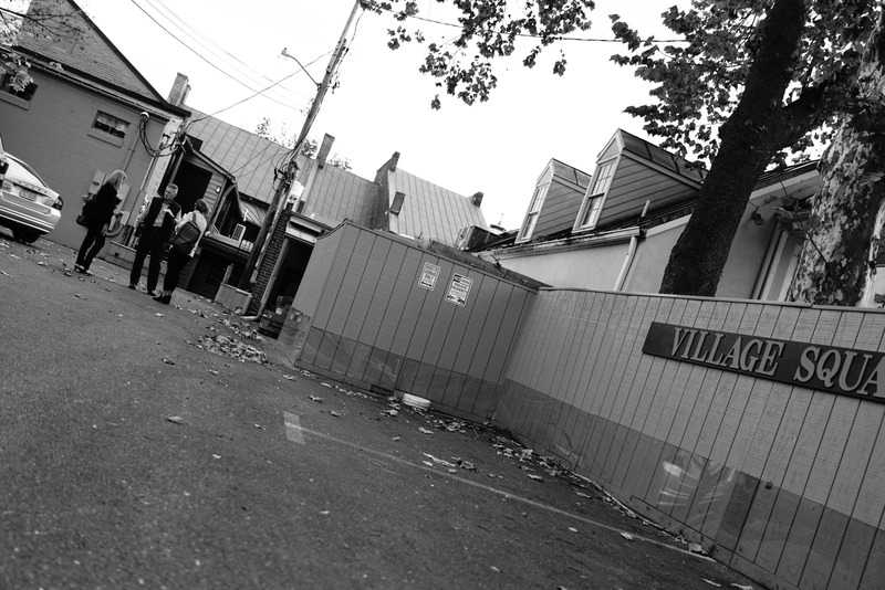 In a narrow alleyway, two people converse casually amidst fallen leaves, while a woman walks by, creating a snapshot of everyday life. The black-and-white composition enhances a sense of nostalgia, emphasizing the textures of the buildings and the serene mood of the scene. Low-angle lighting casts subtle shadows, drawing attention to the interactions within this quiet, urban enclave.
