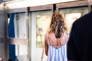 The photograph captures a woman from behind, gazing at the approaching train doors, evoking a sense of anticipation and transition. Sunlight softly illuminates her wavy hair and the simplicity of her striped attire, creating a contrast against the sleek, metallic surroundings. The composition focuses on her solitary figure amid the bustling urban environment, underscoring themes of movement and choice.