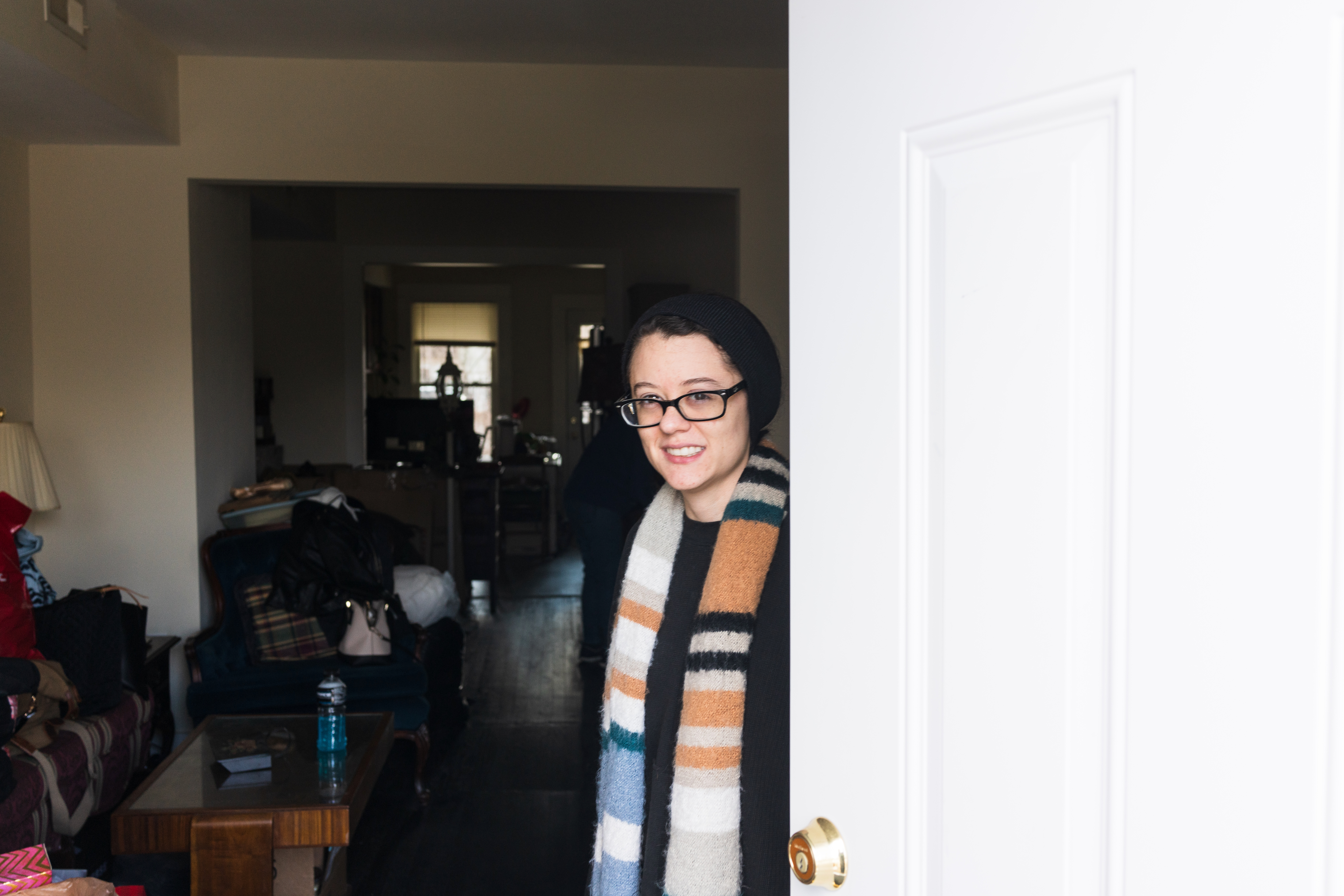 The photograph captures a young woman peering from behind an open door, exuding warmth and friendliness. The soft natural light illuminates her smile, creating an inviting atmosphere that contrasts with the cluttered background of her home. The cozy scarf she wears adds a touch of personality, enhancing the intimate, candid feel of the moment.