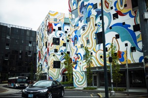 This photograph captures a striking building adorned with colorful abstract murals, creating a sense of vibrancy amidst the urban landscape. The dynamic patterns in bright hues contrast sharply with the dark facade of the adjacent structure, enhancing the playful mood of the scene. Glistening under soft, diffused daylight, the composition invites viewers to explore the intersection of art and architecture in a lively city setting.