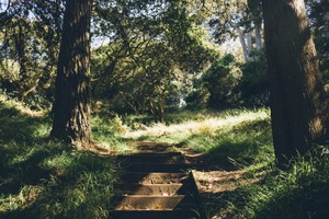 A serene pathway leads upward through a lush forest, framed by towering trees that create a sense of embrace and tranquility. Soft beams of sunlight filter through the leaves, illuminating the worn steps and adding warmth to the cool, green surroundings. The gentle rustle of leaves and the quiet ambiance evoke a feeling of peaceful solitude, inviting exploration and reflection.