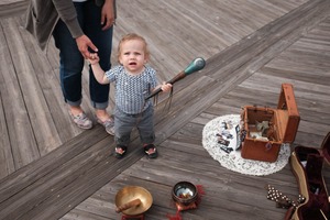 A young toddler stands on a wooden dock, clasping a colorful object while looking up with a mix of curiosity and concern. The soft, diffused light casts gentle shadows, enhancing the candid emotion of the scene, while various trinkets scattered on a lace cloth hint at a whimsical adventure unfolding. The presence of an adult, slightly out of focus, adds a sense of security and connection, blending playfulness with an underlying narrative.