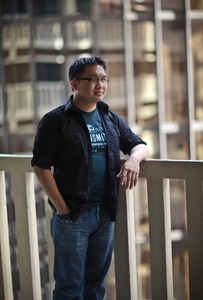 The photograph captures a contemplative figure leaning against a balcony railing, exuding an air of casual confidence amidst a contemporary urban backdrop. Soft natural light bathes the scene, casting gentle shadows that enhance the serene mood. The contrasting textures of the subject's clothing and the architectural details create a harmonious blend of human presence and urban life.