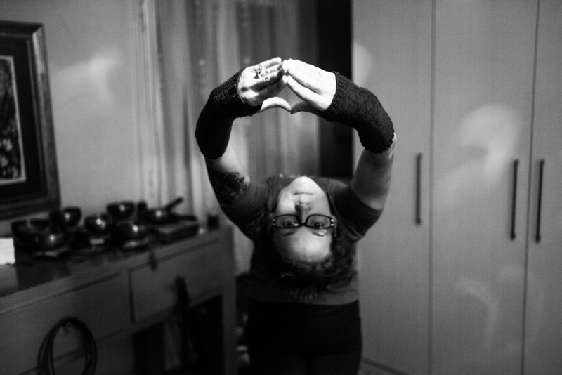 In a striking black-and-white composition, the subject bends gracefully, forming a heart shape with her hands overhead. The soft lighting casts gentle shadows, enhancing the intimate mood within the cozy, domestic setting. Her tattoos and expressive posture suggest a blend of strength and vulnerability, captivating the viewer's attention.