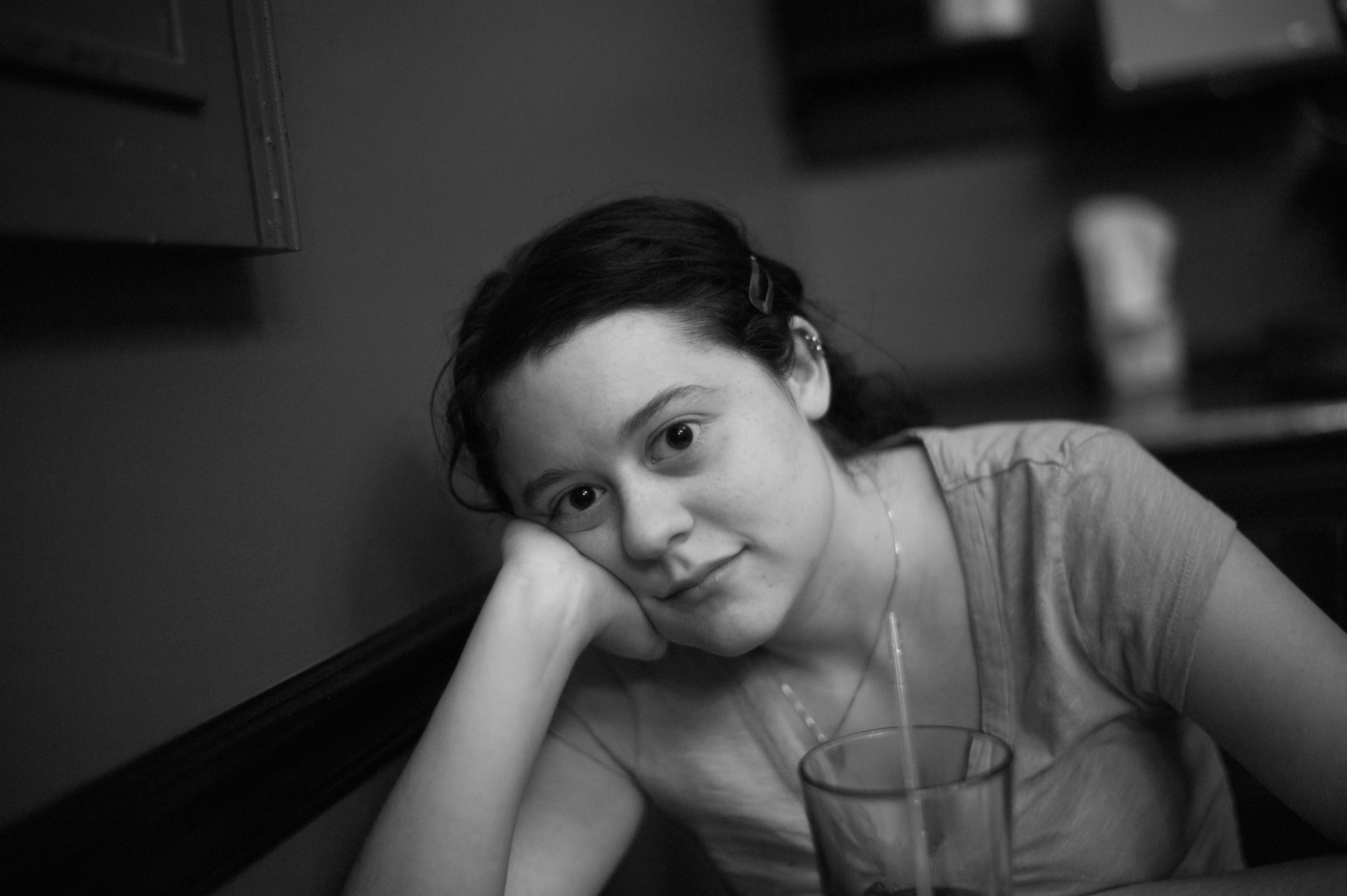 A young woman rests her chin on her hand, gazing intently at the viewer with a thoughtful expression. The black and white composition creates a moody atmosphere, accentuated by soft, natural lighting that gently highlights her features. The blurred background, combined with the intimate setting, adds a sense of introspection and calmness to the scene.
