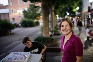 A young woman with a warm smile stands in the foreground, exuding joy and confidence. Soft, ambient lighting casts a friendly glow on the bustling street behind her, creating an inviting atmosphere. The blurred figures and lively greenery add depth to the scene, suggesting a vibrant community evening.