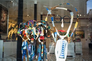 This photograph captures a vibrant display of artistic figures reflected in a shop window, evoking a playful and surreal mood. The colorful, exaggerated features of the characters stand out against the softly blurred background, which enhances the sense of depth and curiosity. Natural light streams in, illuminating the whimsical designs and creating a lively atmosphere that invites passersby to explore the imaginative scene.