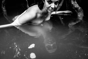 In a serene moment captured in monochrome, a woman emerges partly from the still water, her gaze piercing yet contemplative. The dense foliage and dark reflections create a mood of mystery, while the soft lighting highlights her skin and the subtle textures of the water. The composition draws the viewer’s eye to the interplay of light and shadow, enhancing the intimate connection between the subject and her environment.