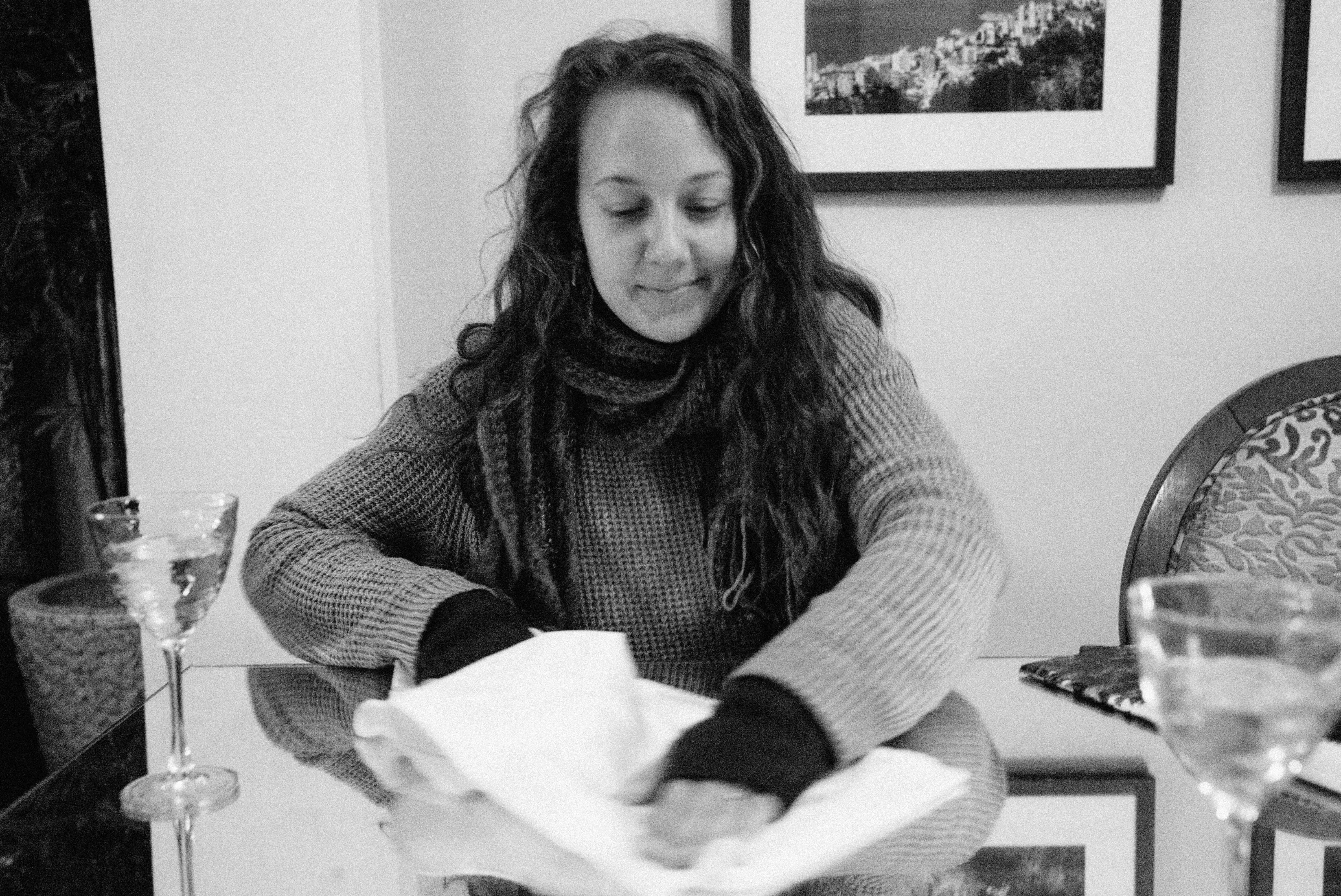 In a softly lit room, a woman gently wipes a table with intention, her focused expression reflecting a serene sense of purpose. The monochromatic palette enhances the intimate mood, while textures from her sweater and the glassware add depth to the composition. Framed photographs in the background hint at memories, amplifying the warmth of this domestic scene.