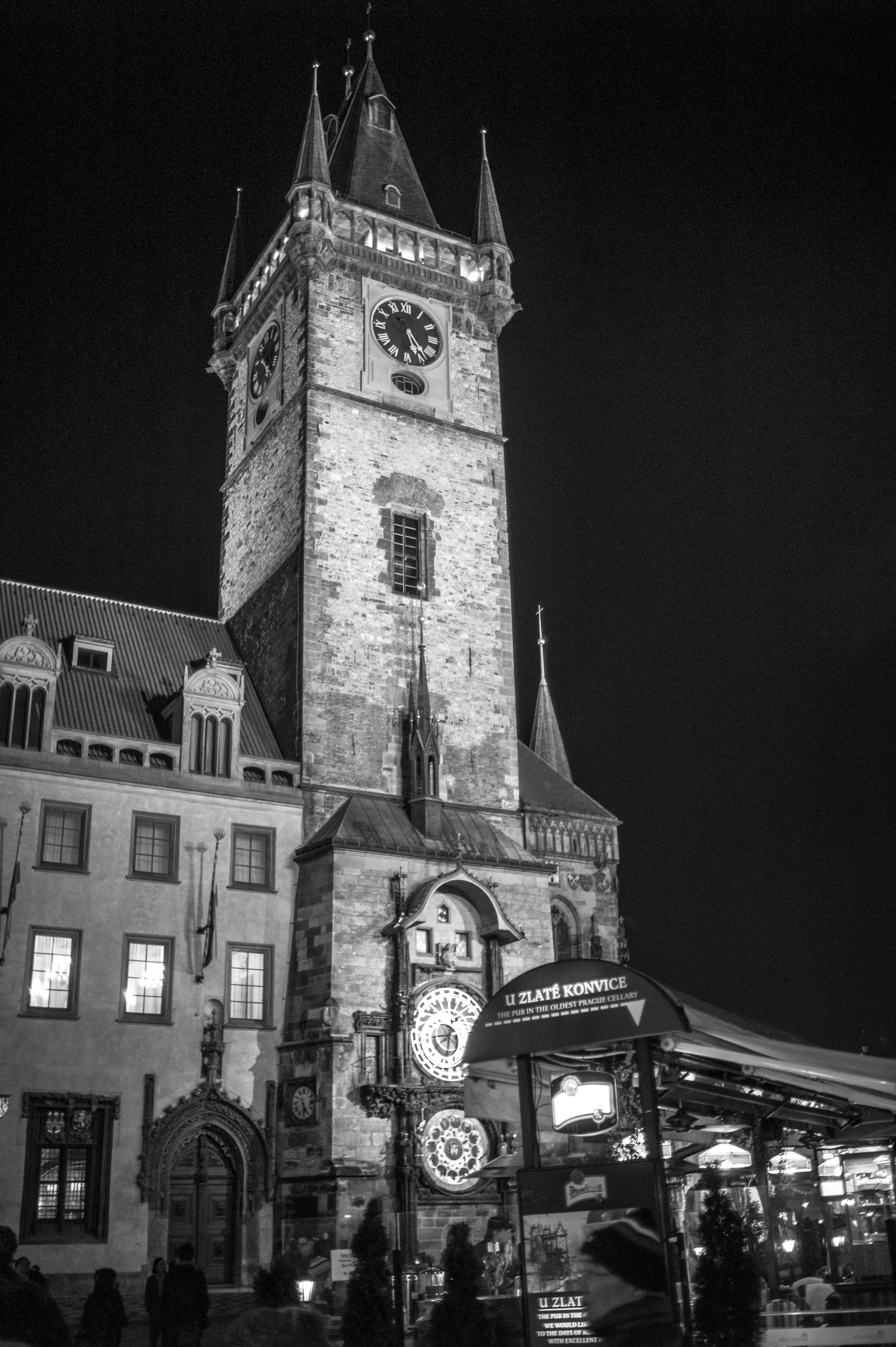 This striking black-and-white photograph captures the grandeur of an old clock tower illuminated against the night sky. The contrasting light and shadow highlight the intricate architectural details, evoking a sense of history and nostalgia. The scene is lively below, with subtle glimpses of passersby and a nearby café adding warmth to the night’s somber mood.