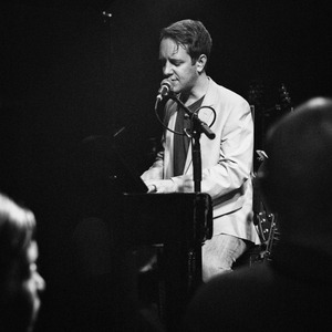 A soulful musician captivates an audience as he passionately plays the piano and sings into the microphone. The dim lighting casts shadows, creating an intimate atmosphere that enhances the emotional depth of the performance. The blurred figures in the foreground hint at an engaged crowd, drawn into the moment by the heartfelt connection between the artist and his music.