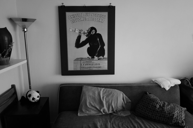 The photograph captures a cozy corner of a living space, centered around a vintage poster of a monkey drinking from a bottle, evoking a sense of whimsy. The low lighting and monochromatic palette create a relaxed atmosphere, while scattered soft furnishings hint at comfort and lived-in warmth. A contrast between the playful artwork and the simplicity of the furniture adds depth to the inviting mood.